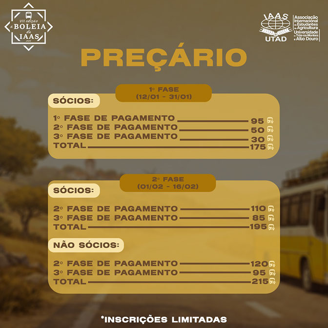"À Boleia da IAAS" consiste numa viagem de quatro dias, por Portugal Continental, visitando diversas explorações de diferentes áreas da Agronomia e da Zootecnia. A IAAS-UTAD assumiu mais uma vez o desafio de realizar este evento, entre 26 a 29 de março de 2026 , sendo esta a sétima edição. A realização desta viagem tem como objetivo dar possibilidade aos alunos de verem no terreno aquilo que é tratado em sala de aula e mostrar a vasta variedade de empresas de sucesso relacionadas com o setor. Mais uma vez, o evento contará com dois autocarros, um destinado à visita a explorações da área da Agronomia e o outro destinado a explorações da área da Zootecnia. DESTAQUEs